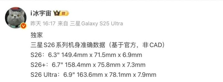 结合爆料来看,三星Galaxy S26将配备6.3英寸屏幕,机身尺寸为149.4mm x 71.5mm x 6.9mm;三星Galaxy S26+将配备6.7英寸屏幕,机身尺寸为158.4mm x 75.8mm x 7.3mm;三星Galaxy S26 Ultra将配备6.9英寸屏幕,机身尺寸为 163.6mm x 78.1mm x 7.9mm。